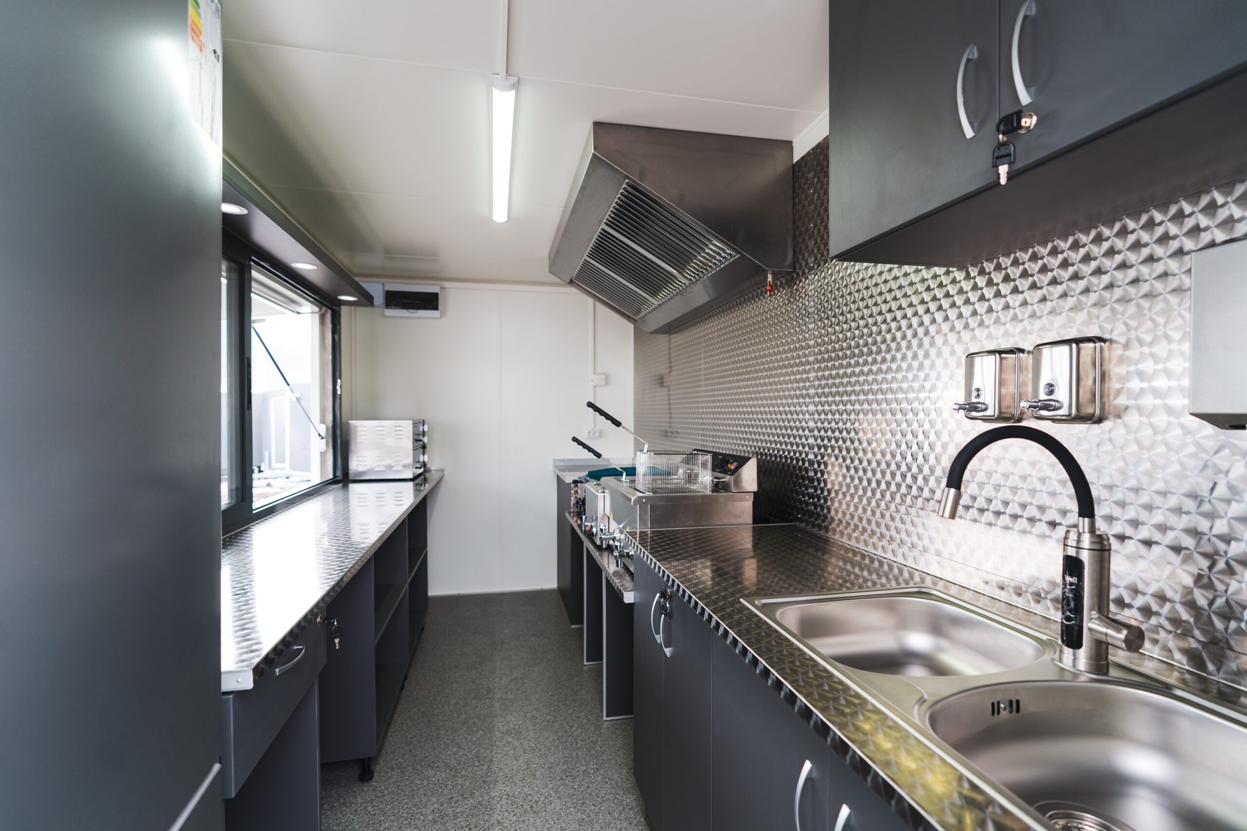 • Instalație apă: chiuvetă inox dublă, pompă, rezervoare apă 30L, încălzitor de apă (robinet instant), pachet igienă inclus.