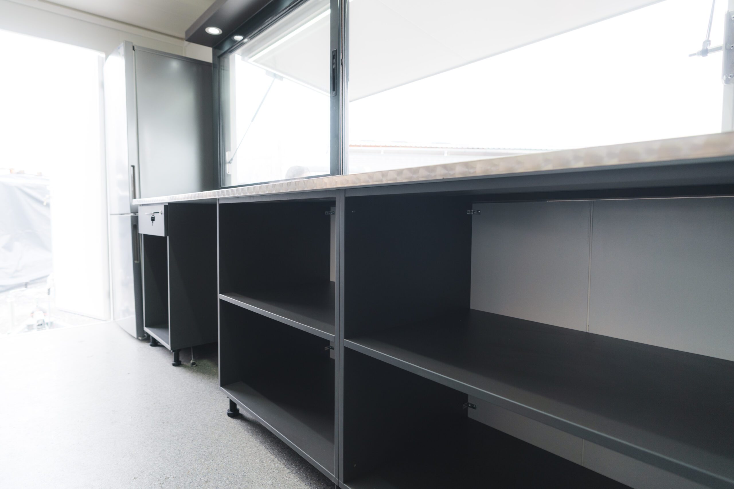 • Mobilier din pal melaminat (culoare personalizată) cu blaturi de lucru din inox rosetat (față și spate), dulapuri, rafturi și sertare.